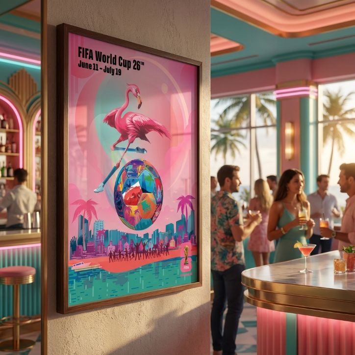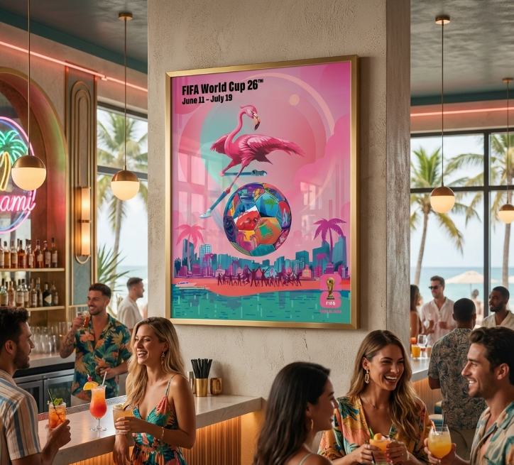 Experience the excitement of the FIFA 26™ World Cup with this beautiful Miami poster! Illustrated by a vibrant flamingo kicking a colorful soccer ball over a bustling city, this artwork captures the spirit of the tournament from June 11 to July 19.